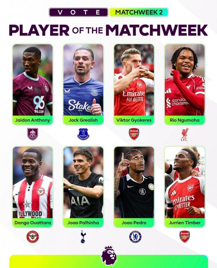 直播吧8月26日讯 英超第二轮战罢,英超官方也列出本轮比赛最佳球员候选名单,具体如下:杰顿-安东尼(伯恩利)格拉利什(埃弗顿)约克雷斯(阿森纳)恩古莫哈(利物浦)奥塔拉(布伦特福德)帕利尼亚(热刺)若昂-佩德罗(切尔西)廷伯(阿森纳)...